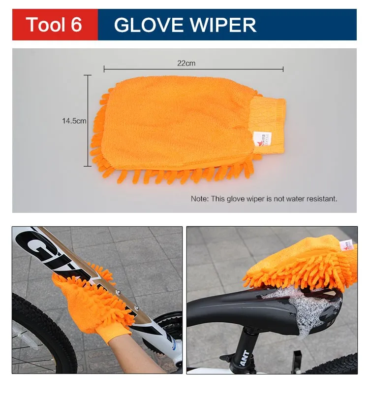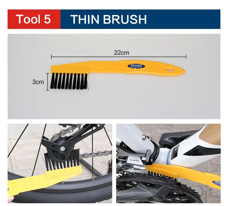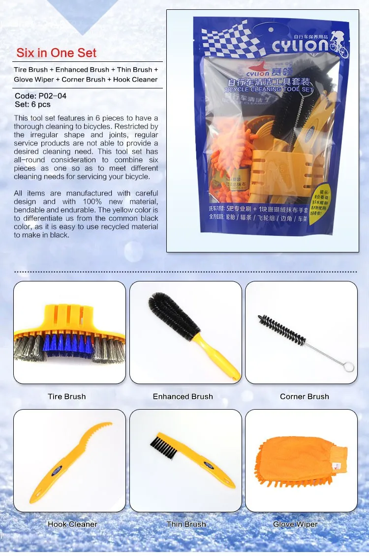 This tool set consists of 6 pieces, featuring in providing thorough cleaning to bicycles. Restricted by the irregular shape and joints, regular service tools are not able to give a convenient and easy cleaning. This tool set has all-round consideration to combine six pieces as one so as to meet different cleaning needs for servicing your bicycle.