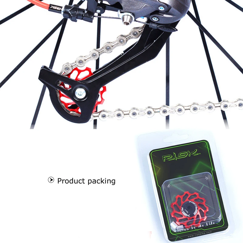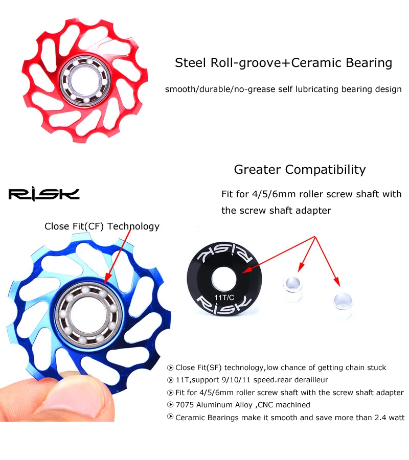 -Aluminum alloy guide wheel body and steel bearing, lightweight and durable. -Compatible for most of rear derailleur on the market and support 9/10/11 speed.